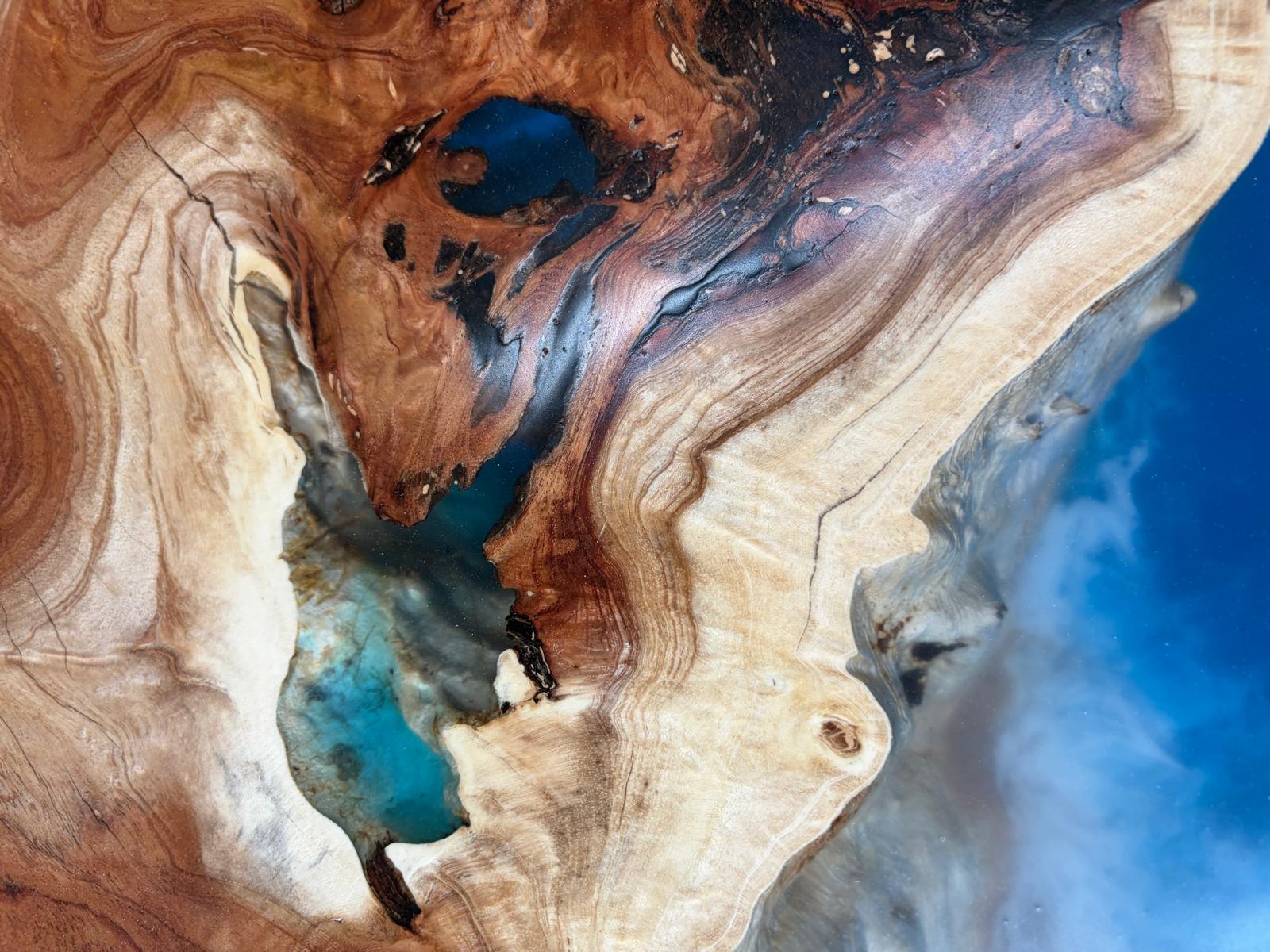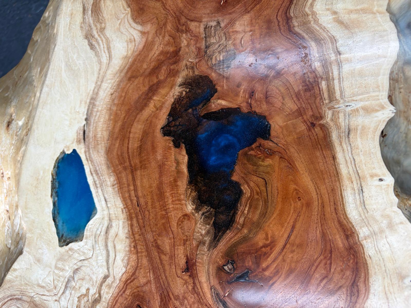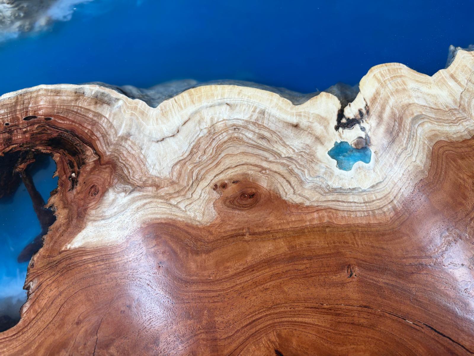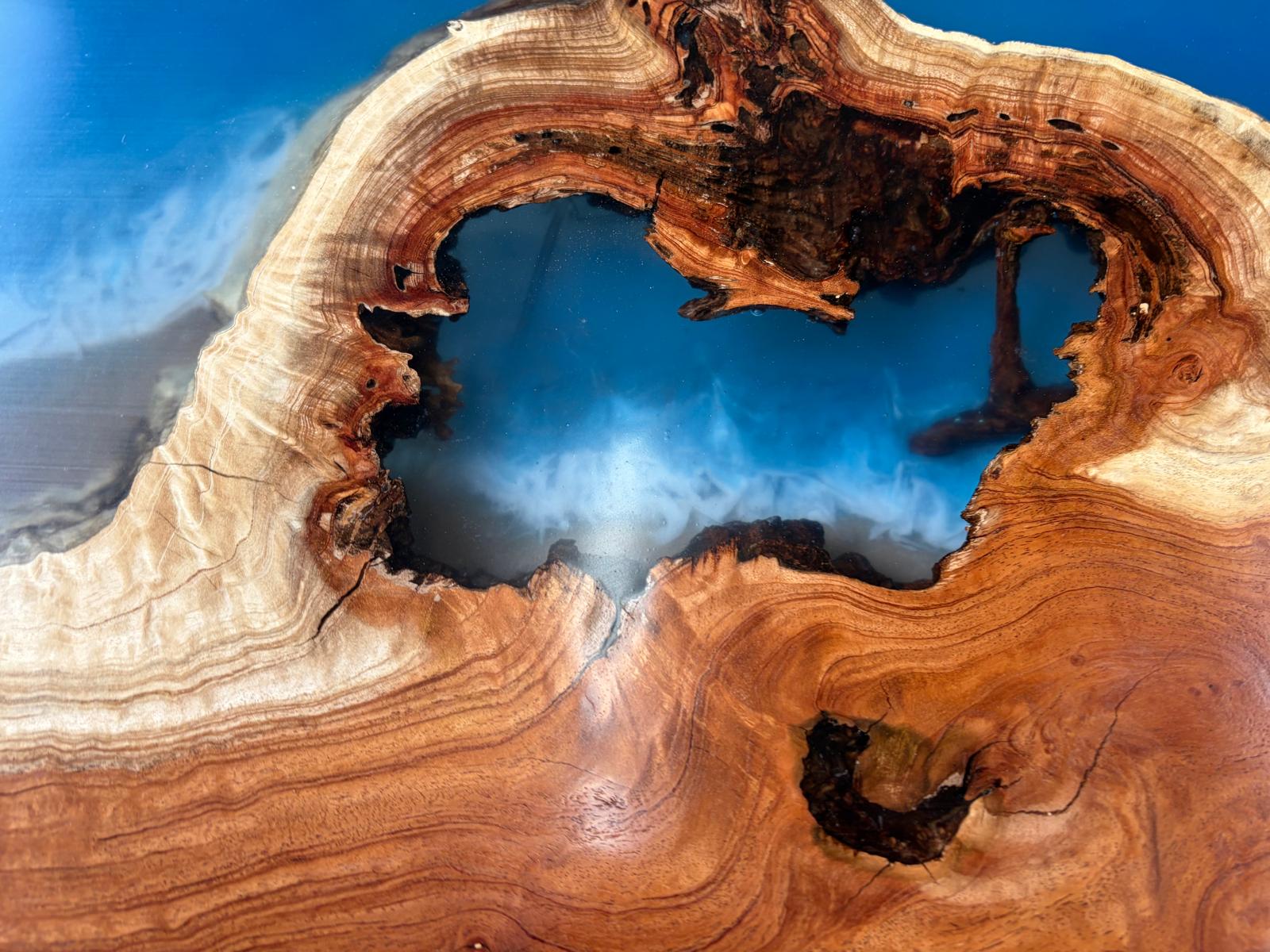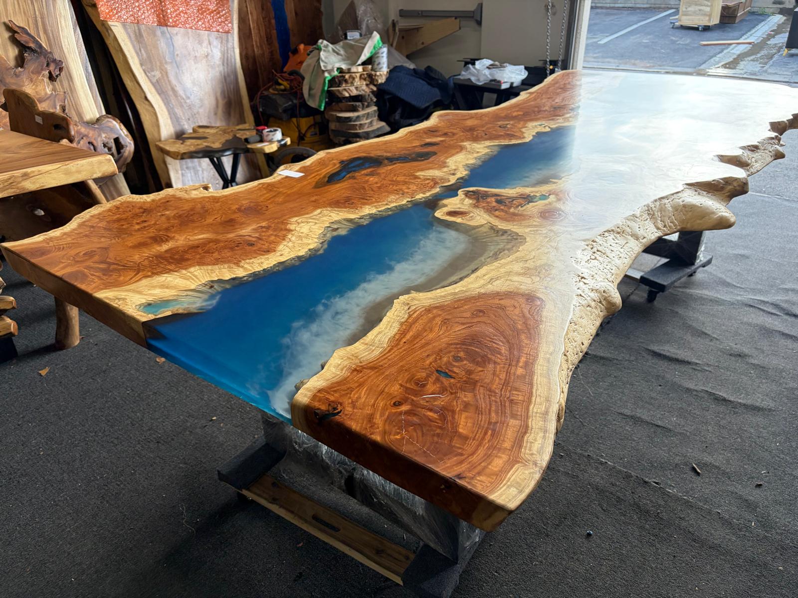 A one-of-a-kind MIMBA burl live edge epoxy wave table with real sand and a subtle waterfall detail. Hand-crafted over many hours. 43 to 52 inches wide. $9,095 cash or $10,095 other.
