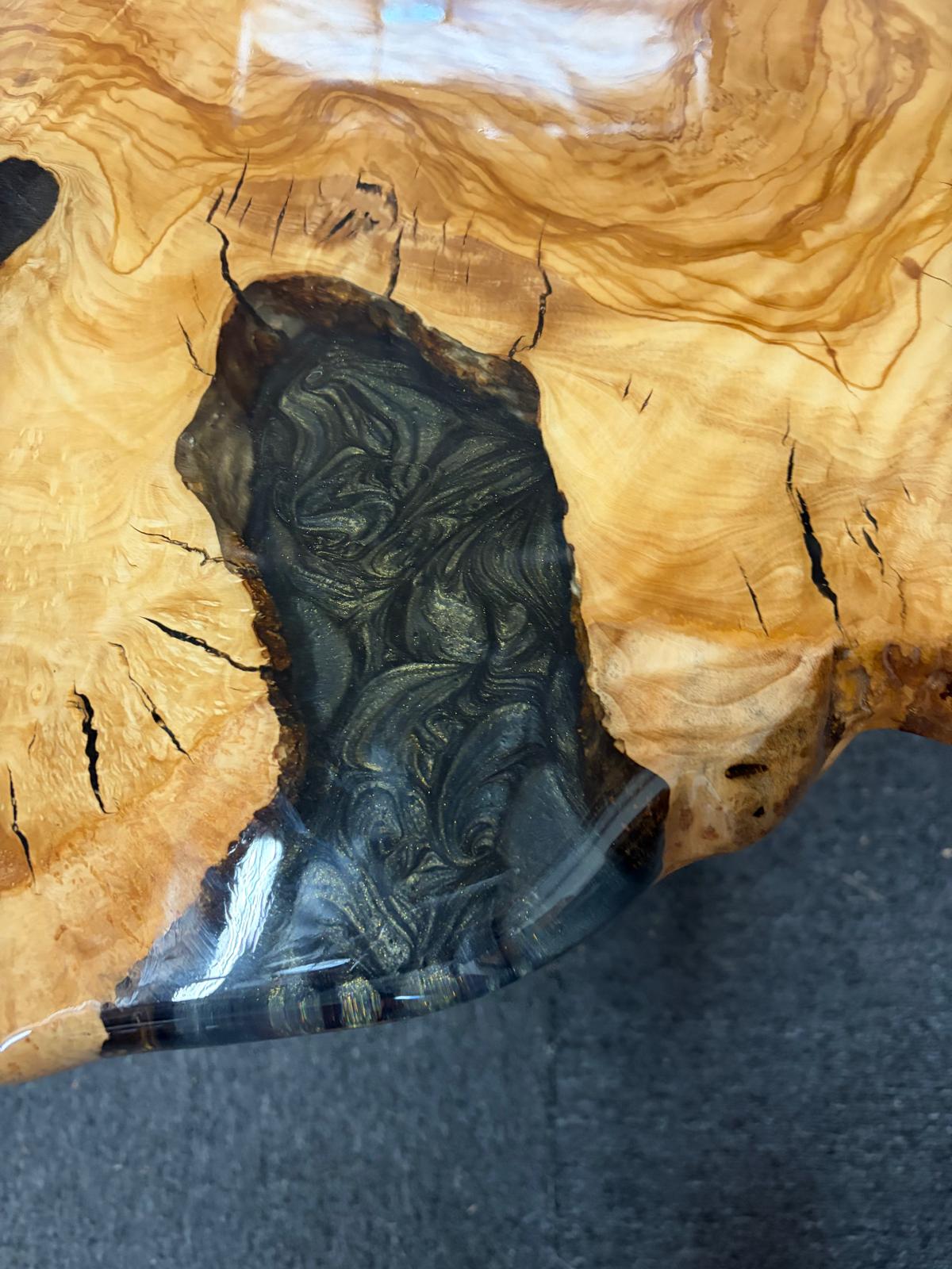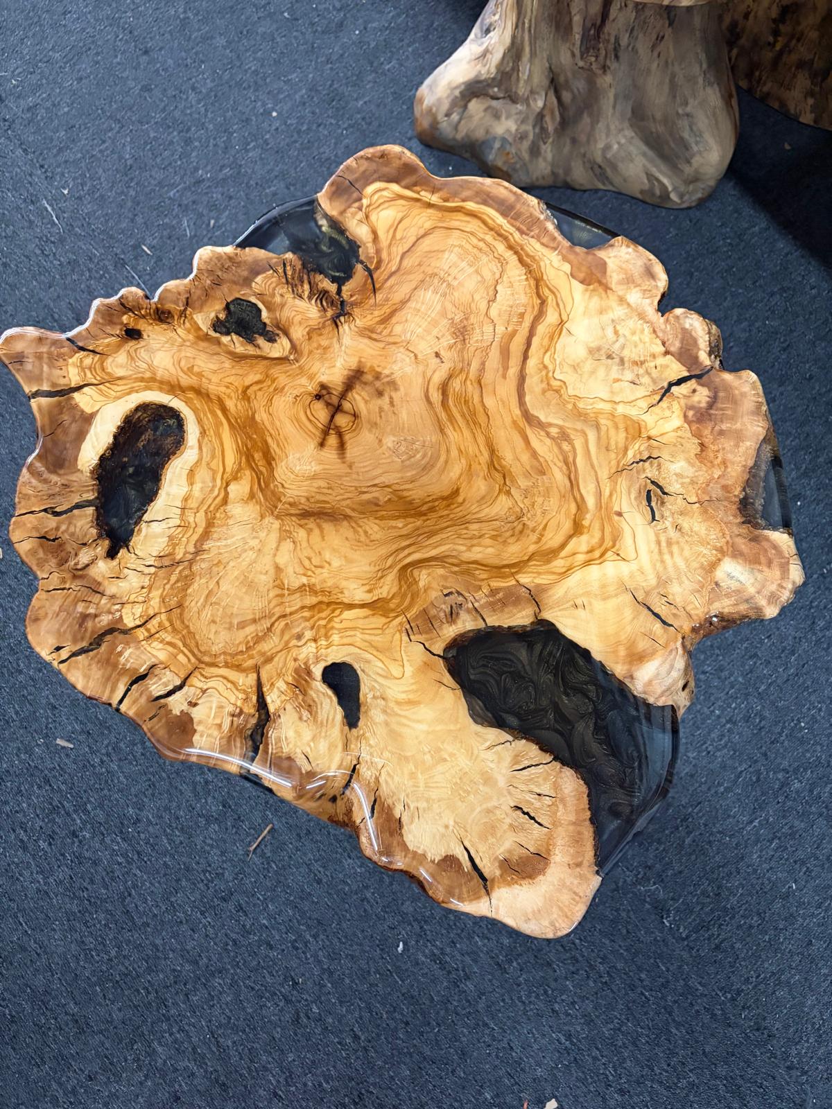 Olive wood side table with natural-tone epoxy that blends seamlessly into the wood. 22 to 25.5 inches wide, 20 inches high.