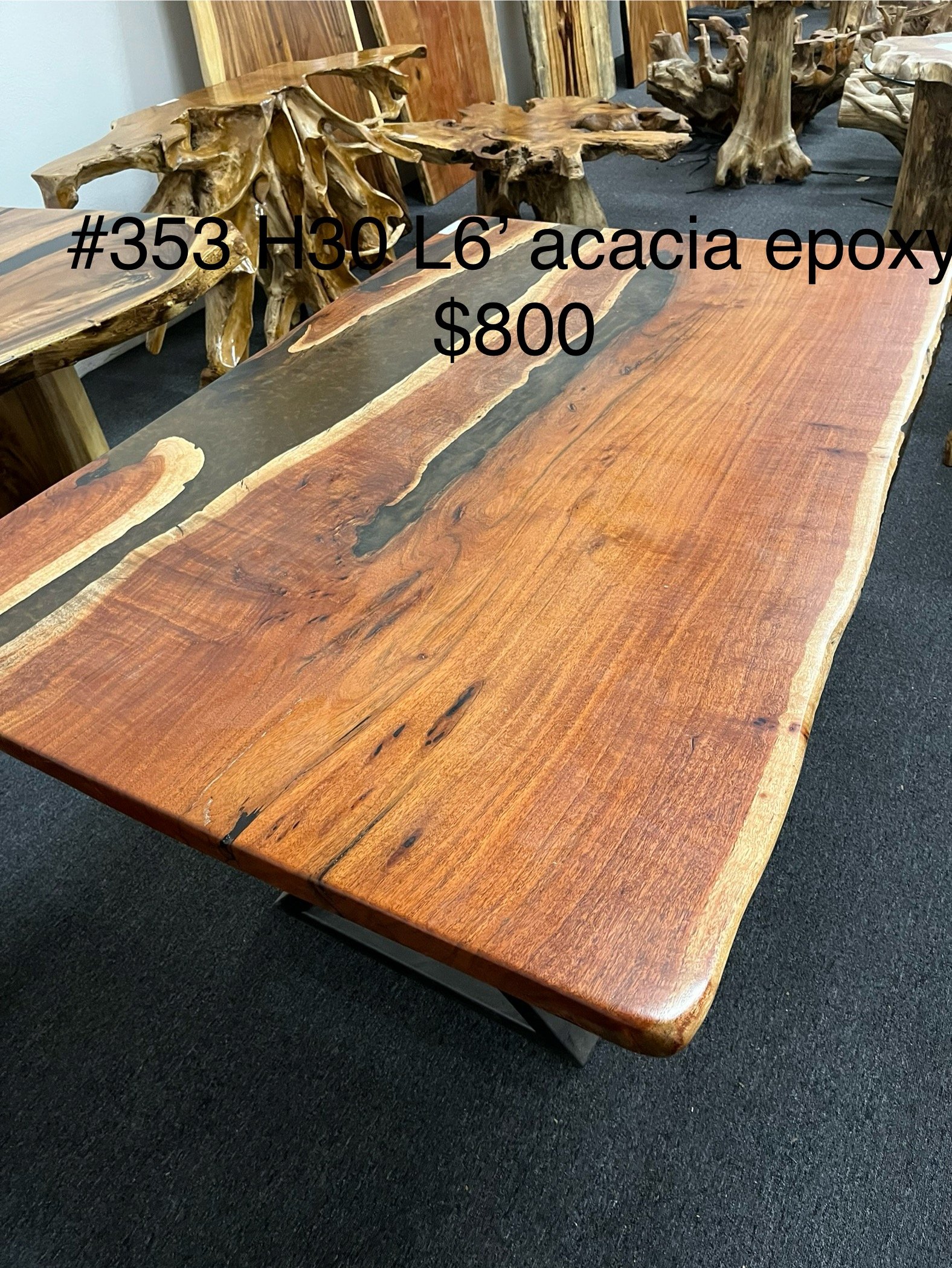 Single Slab Acacia Dining Table with Brown Epoxy with Swirls on a Modern Base
