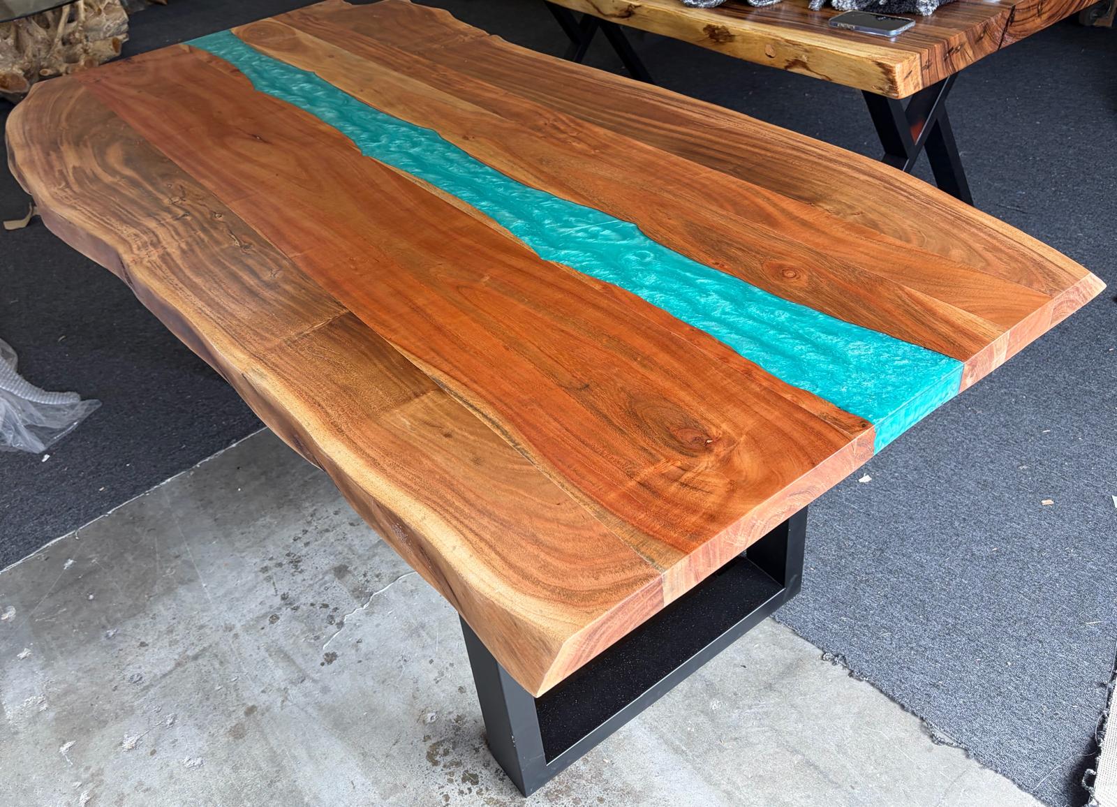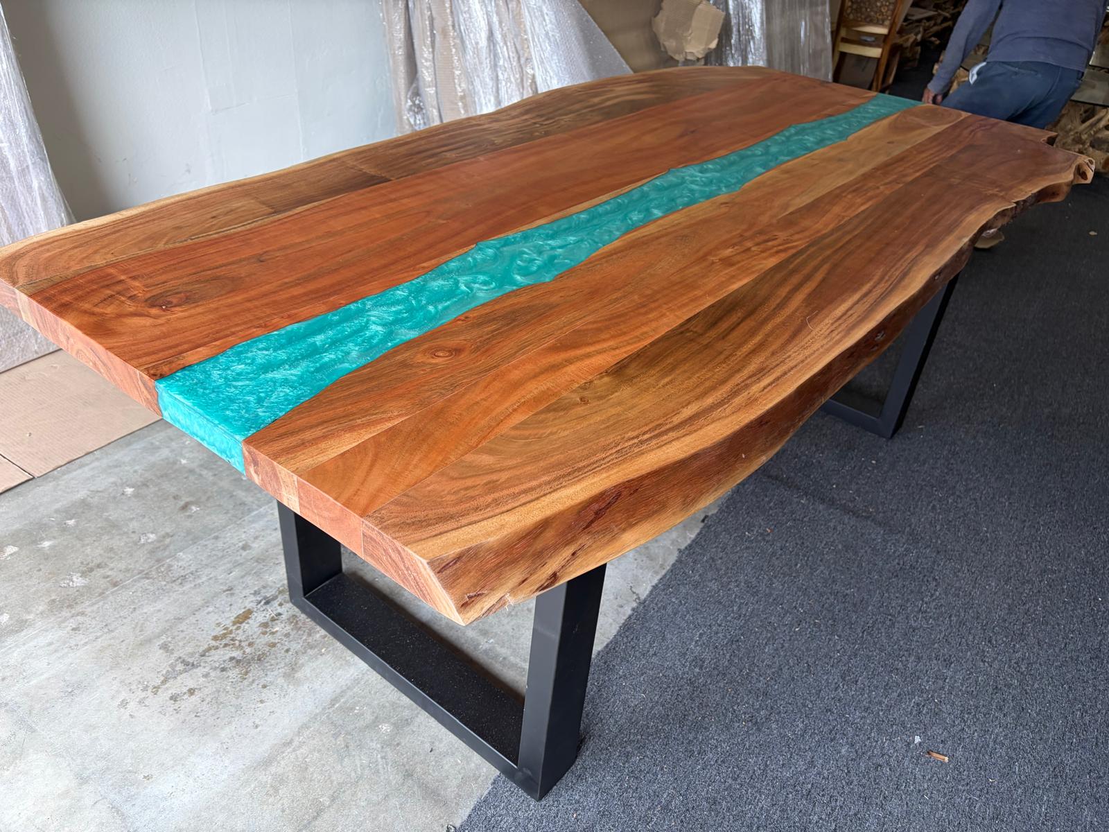 7ft acacia dinn table with turquoise epoxy 2″ thick